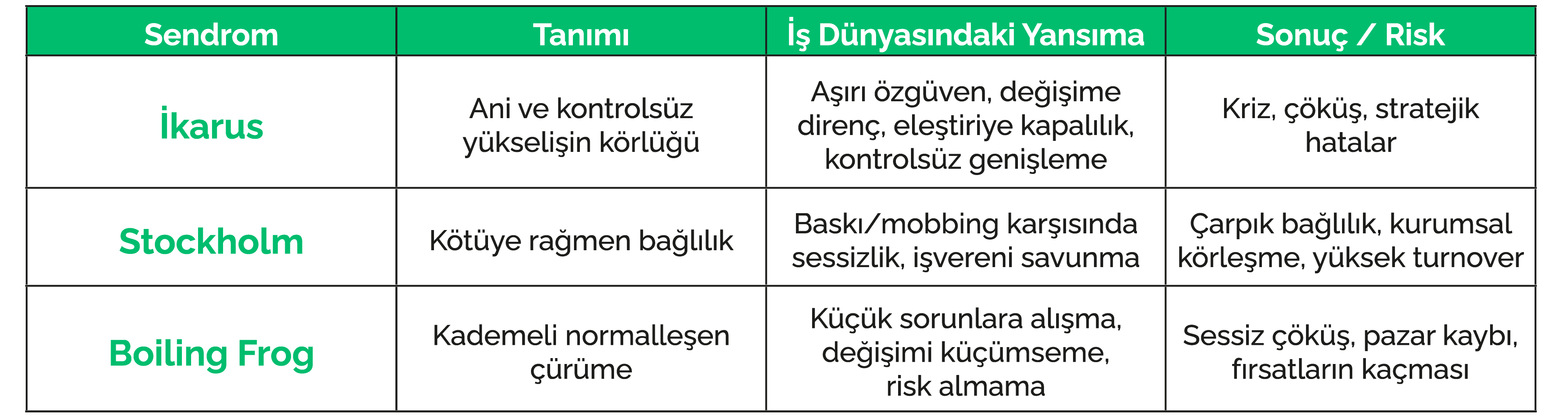 Örneğin [‘ikarus sendromu’nda] bir birey veya şirket, hızlı ve büyük bir başarı elde ettiğinde, bu başarıyı getiren etkenleri sorgulamayı veya tedbiri elden bırakmayı ihmal edebilir. Bu durum, özellikle aşırı özgüven, değişime direnç, eleştiriye kapalı olmak ve kontrolsüz genişleme gibi sonuçları içinde barındırır. Elde edilen başarılar, kişinin veya şirketin risk toleransını artırır ve gerçekçi olmayan hedefler belirlemesine neden olur. Bu durum, stratejik kararların değil, duygusal tatminin peşinde koşulmasına yol açabilir. Benzer sonuçları psikoloji literatüründe mağdurların kendilerine zarar veren kişilere karşı zamanla bir bağlılık geliştirmesi olarak bilinen ‘stockholm sendromu’nda da görebiliriz. İş yaşamına uyarladığımızda bu sendrom, çalışanların maruz kaldıkları baskı, mobbing ya da adaletsizliğe rağmen işverene sadık kalmaları, hatta dışarıya karşı onu savunmaları şeklinde ortaya çıkabilir. Günün sonunda ise kurumsal çarpık bağlılık ve körleşme ve yüksek ‘turnover’ sorunuyla yüzleşilir.